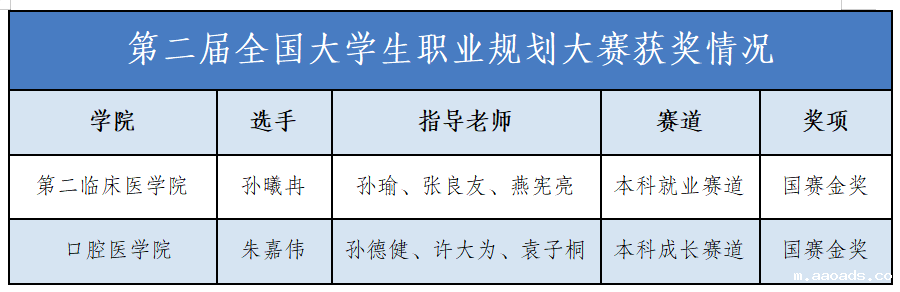 4月17日至19日,第二届全国大学生职业规划大赛总决赛在湖南长沙举行。我校第二临床医学院2021级临床医学(急救与救援医学)专业孙曦冉同学和口腔医学院2023级口腔医学专业朱嘉伟同学凭借出色表现,分别斩获就业赛道高教本科组金奖、成长赛道高教本科组金奖,获金奖数在省内高校中并列第一,在全国独立设置医学院校中位列第一!