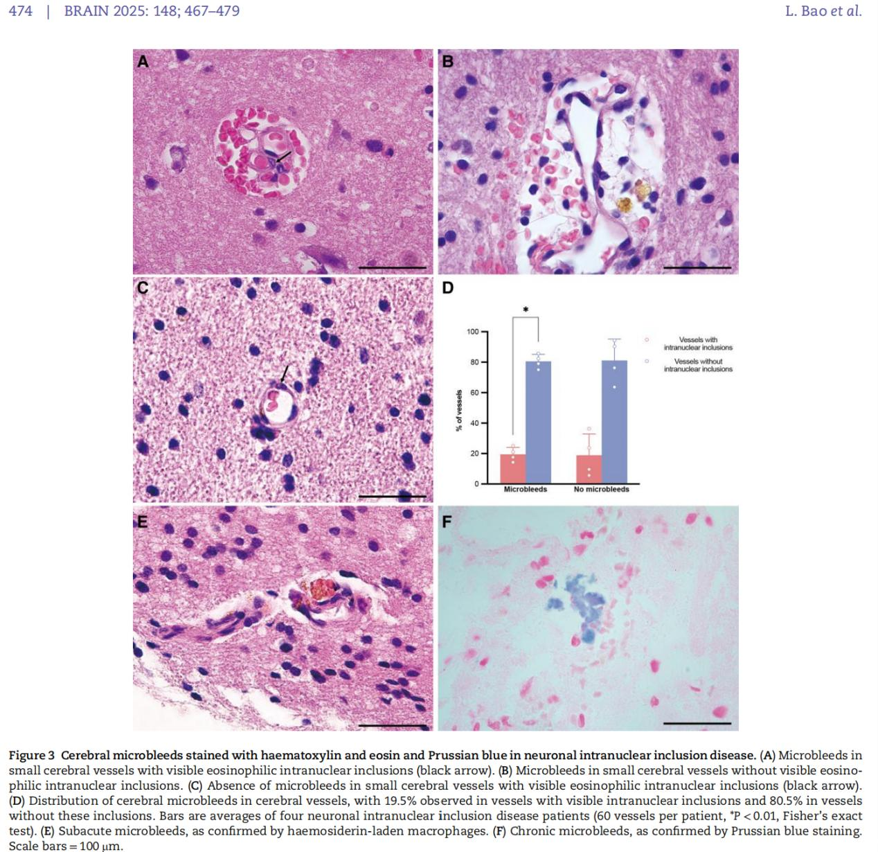 该研究成果显示,NOTCH2NLC 基因 GGC 重复扩增会使其翻译出富含甘氨酸的蛋白质 uN2CpolyG。这种蛋白质不仅会在神经元内聚集形成包涵体,还能沉积在血管壁形成淀粉样物质,导致患者出现进行性认知功能障碍、多发脑微出血、反复皮层下梗死、关键脑区白质病变(外囊、颞极)、脑叶出血等症状。这一发现有助于解释神经元核内包涵体病患者特有的一些临床表现,像卒中样发作、癫痫发作、偏头痛发作、脑炎样发作等,这些症状实际上可能是由脑血管淀粉样变引起的短暂性局灶性神经系统发作(TFNE),即 “淀粉样发作(amyloid spells)”。