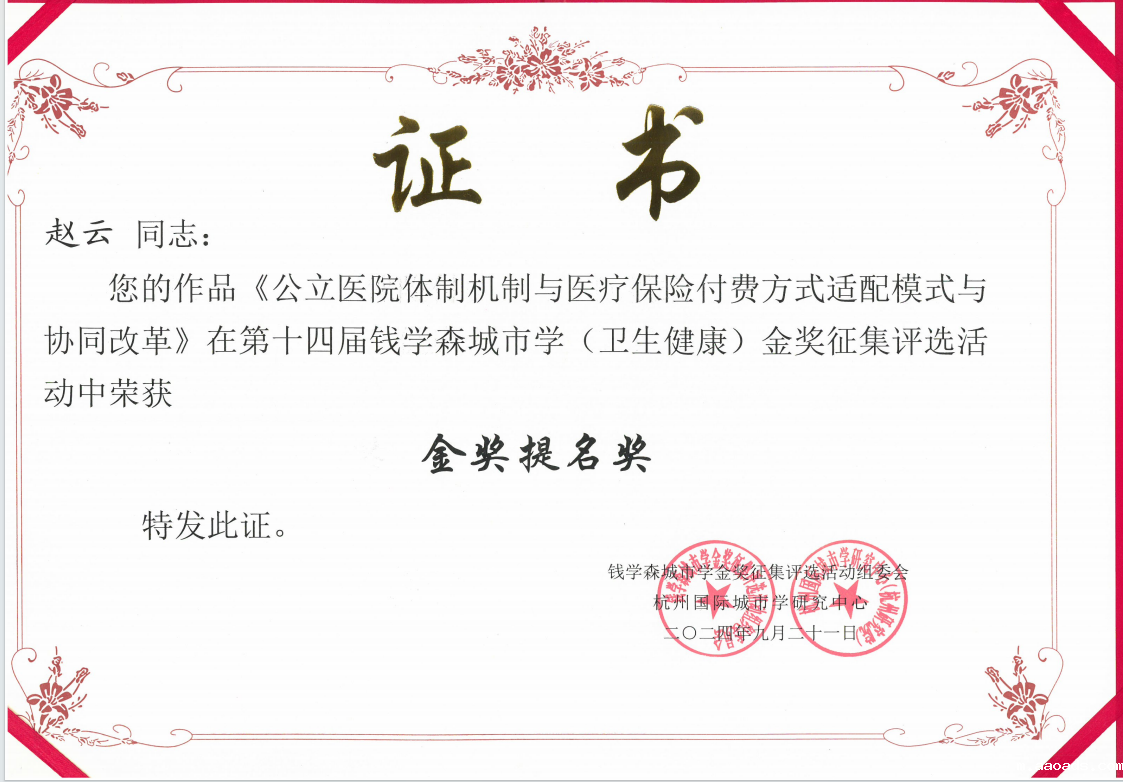 近日,第十四届“钱学森城市学金奖”评选结果揭晓。我校管理学院赵云教授的学术专著《公立医院体制机制与医疗保险付费方式适配性研究》获得本届钱学森城市学(卫生健康)金奖提名奖。这是我校学术成果首次获得该奖项提名奖。