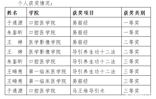 我校组队参加本次赛事,在运动员与教练员的共同努力下,荣获集体赛易筋经二等奖、导引养生功十二法二等奖;荣获个人赛易筋经一等奖2项(男子组1项、女子组1项)、二等奖1项(女子组)、三等奖1项(女子组),导引养生十二功法二等奖1项、三等奖2项(女子组),马王堆导引术三等奖1项(男子组)。