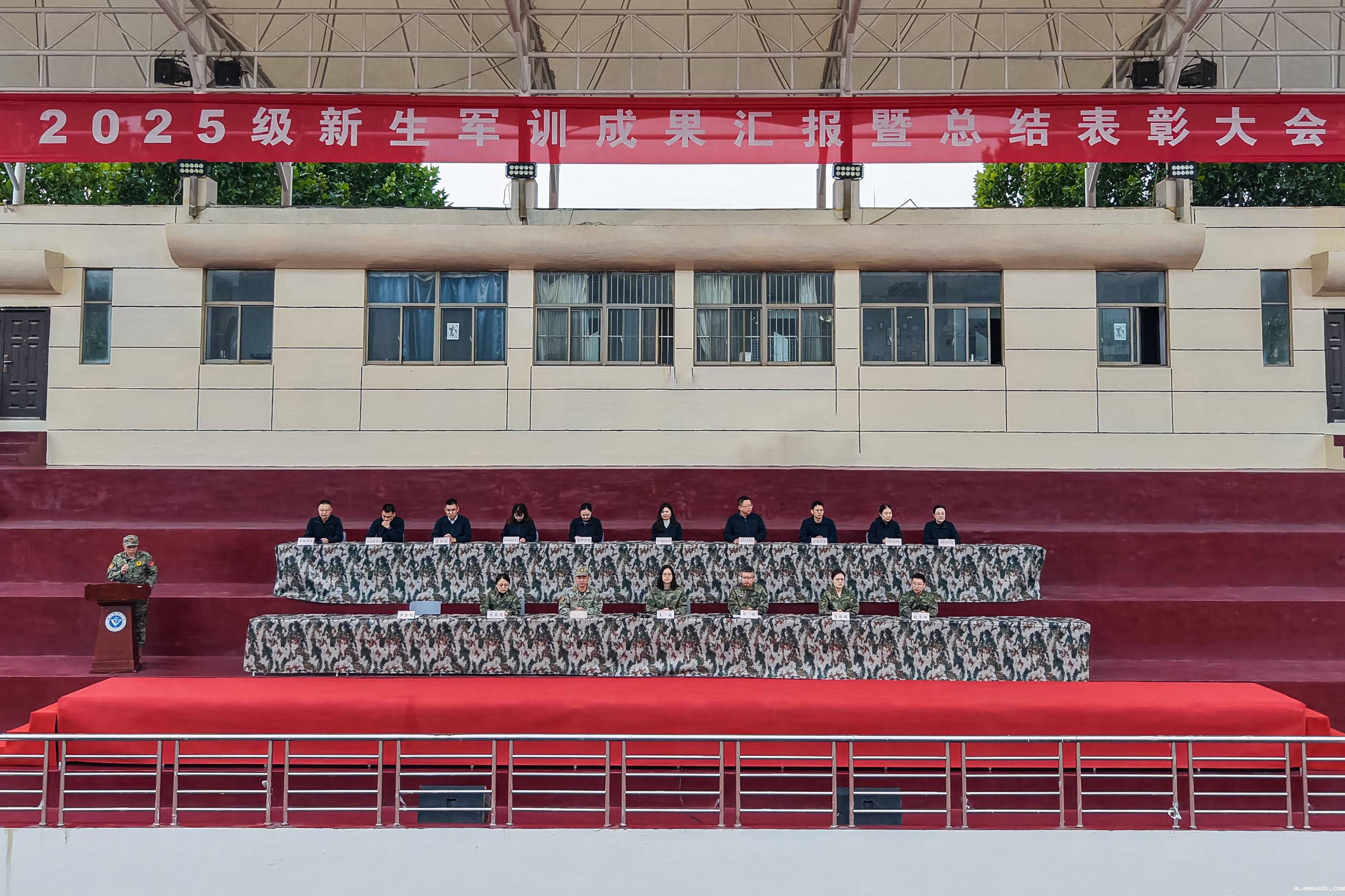 秋光正好,田径场上迷彩跃动,青春飞扬。10月25日上午,我校2025级学生军训成果汇报暨总结表彰大会在田径场拉开帷幕。校领导王媛、郭栋,校军训领导小组成员,承训部队领导出席了大会,承训部队全体教官、各学院相关负责人、新生辅导员以及全体2025级新生参加了大会,大会由军训旅副旅长、武装部部长尹荣刚主持。