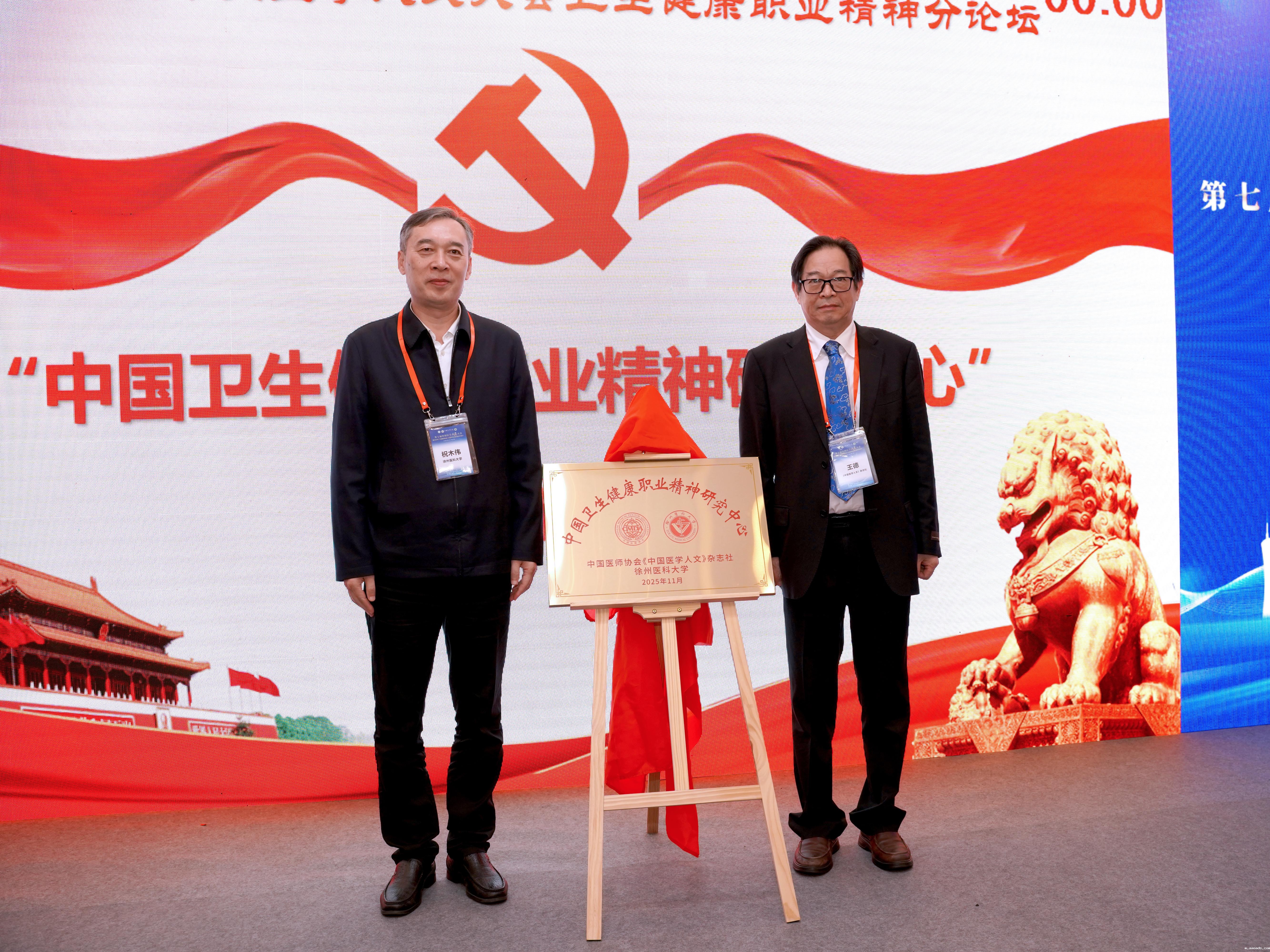 王德和祝木伟共同为“中国卫生健康职业精神研究中心”揭牌。学校联合中国医师协会《中国医学人文》杂志共同成立该研究中心,将会进一步加强卫生健康职业精神研究,推动卫生健康文化高质量发展。