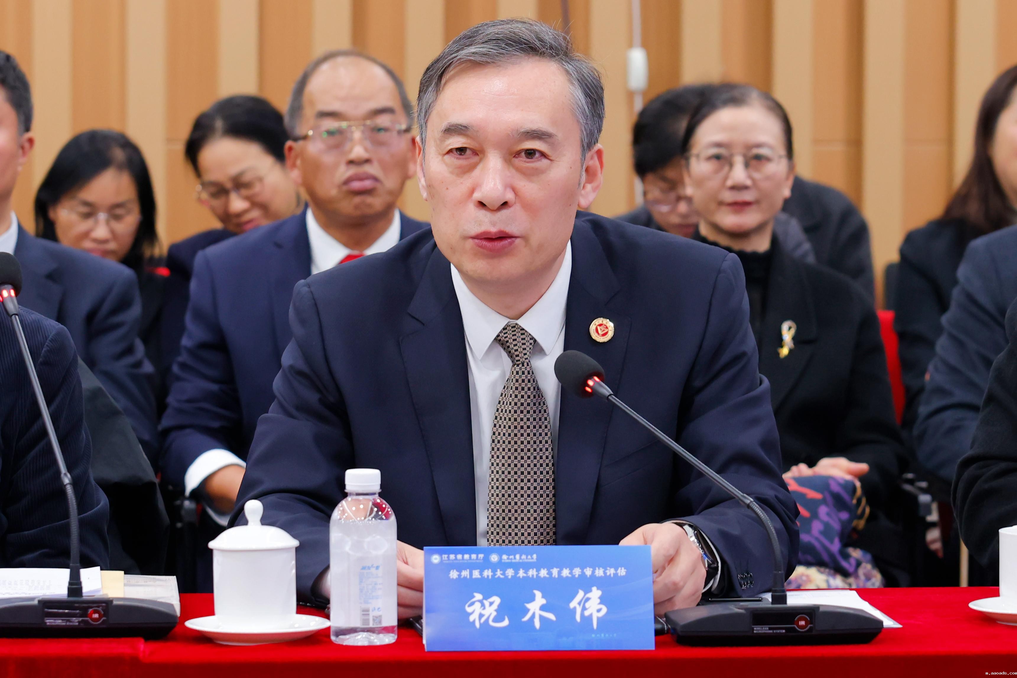 祝木伟代表学校作表态发言。他表示,专家组反馈的评估意见站位高、把脉准、问题实,为学校今后的改革和发展指明了方向,学校党委完全认同、全部认领、诚恳接受。针对专家组反馈的问题,学校将进一步强化政治责任,以思想自觉凝聚整改共识;坚持靶向发力,以责任闭环确保整改实效;突出长效推进,以整改成效赋能高质量发展。学校将继续秉承“培养医德高尚、医技高明的卓越医学人才”的初心使命,奋力谱写“特色鲜明、国内一流的高水平医科大学”建设新篇章,在江苏“挑大梁”的发展大局中勇担重任,在教育强国、健康中国建设的伟大征程中奋勇争先,努力作出徐医新的更大贡献。